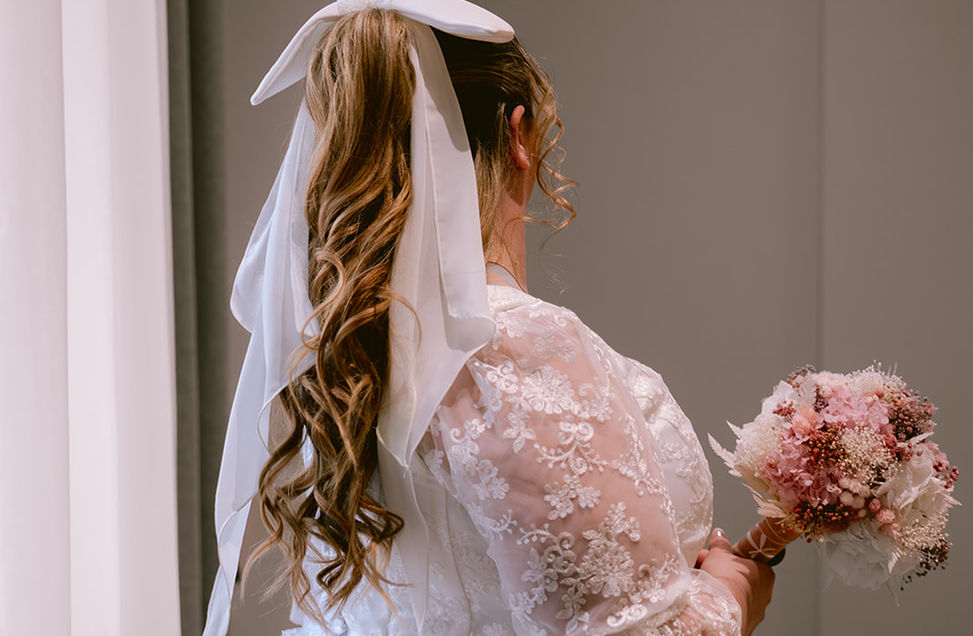 Su vestido combinaba un cuerpo con escote cuadrado con una falda de gasa ligera y elegante, cubierto con un delicado encaje romántico que aportaba textura y sofisticación. Diseñamos mangas desmontables para que pudiera adaptar el estilo según la ocasión, y añadí un lazo combinado a modo de tocado, acompañado por dos finas capas de gasa que daban movimiento y delicadeza a la silueta.